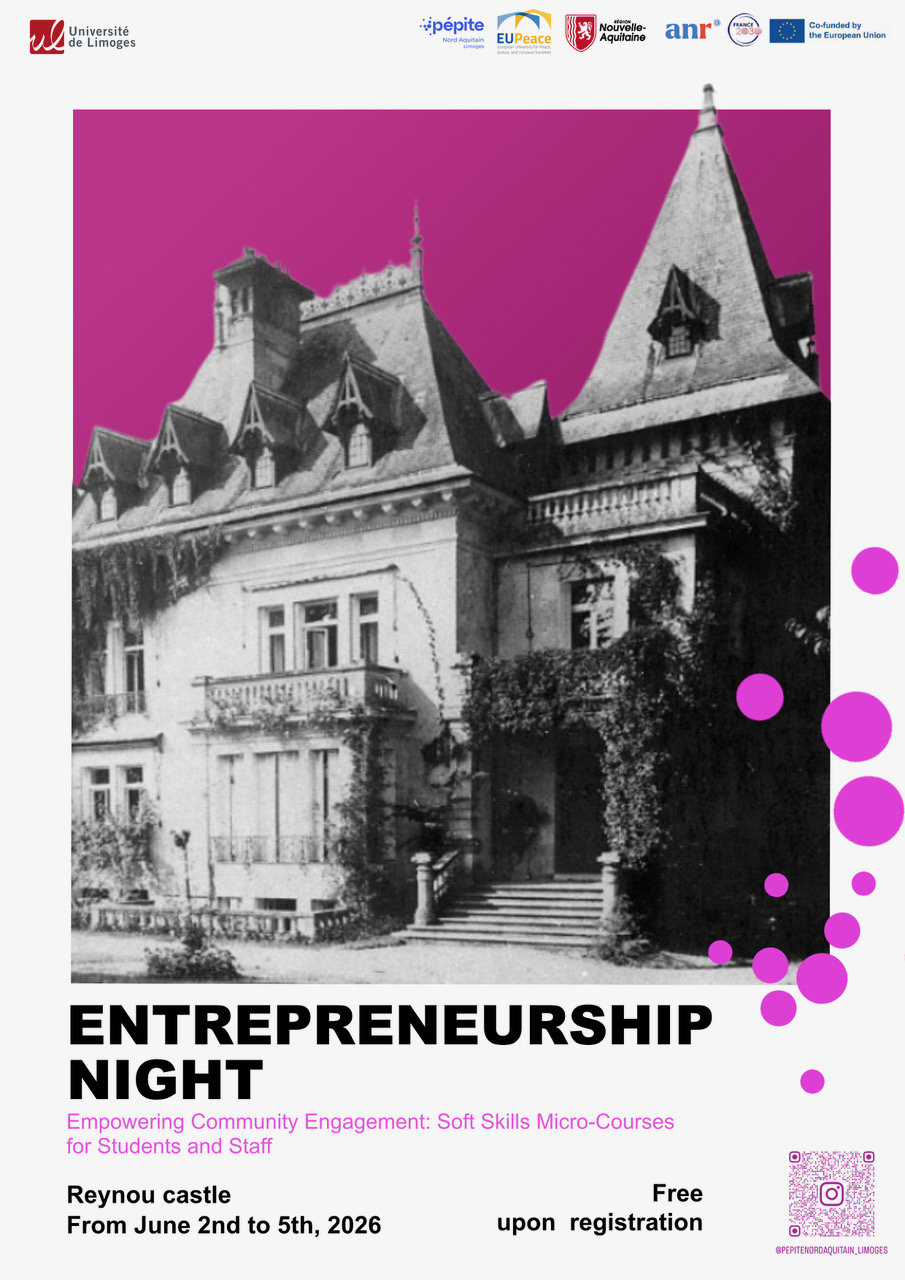 Organised by PEPITE (the student entrepreneurship hub) and the International Office of the University of Limoges, this event takes place in Limoges and at the Domaine de Reynou. The University of Limoges covers accommodation costs from 2-5 June (three nights) as well as the meals and activities from the night of 1 June to 4 June.