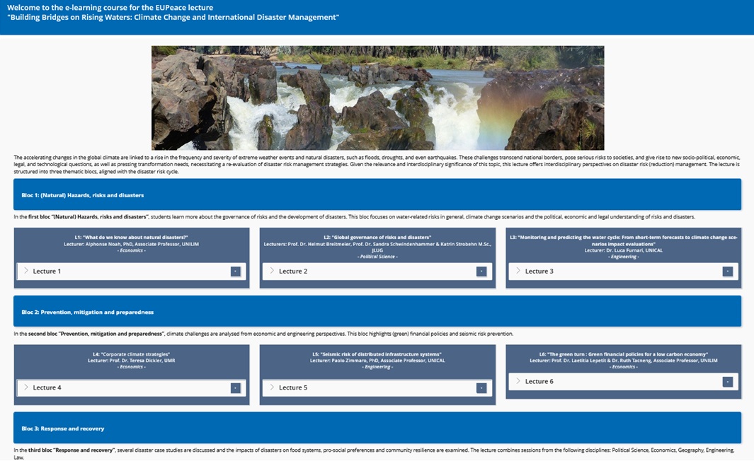As a project result, an asynchronous lecture series was developed, comprising eight lectures by eleven lecturers from Justus Liebig University Giessen (JLU), Philipps University Marburg (UMR), University of Limoges (UNILIM), and University of Calabria (UNICAL). The lecture combines insights from geography, economics, environmental engineering, political science and sociology. It is hosted by the Center for International Development and Environmental Research (ZEU). From October 2025 to March 2026, the lecture is offered for the first time at the JLU. Students from the EUPeace network and JLU partner universities were able to register via the Virtual International Programme (VIP), the Virtual European Exchange Programme (VEEP) and the EUPeace European Track Certification Programme. Currently, 32 students from ten countries, namely Ghana, Turkey, France, Italy, Poland, Sri Lanka, Ukraine, Peru, Greece and Germany, are participating in the lecture. Three live events are offered to promote exchange among the students and address their questions. For each lecture, students have to answer at least three self-testing questions or play a simulation game to pass the unit. The charts below provide an overview of this semester’s scheduled lectures and their practical implementation on the “ILIAS” e-learning platform: